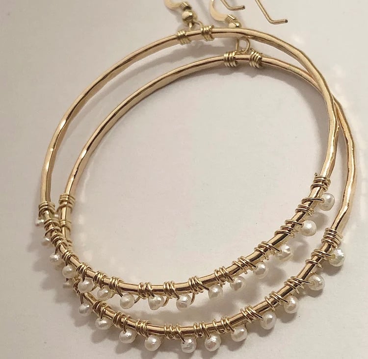 This listing is for the beautiful Boho Bride Hoop earrings. These hoops are adorned with delicate, white freshwater pearls that are carefully, and elegantly, wire-wrapped around a sturdy, hammered hoop. Hoops measure to be 6.5 inches in circumference. If you'd like your hoops made in a different size, please email me at [email protected] - I'd be happy to make you a pair of these beautiful earrings!