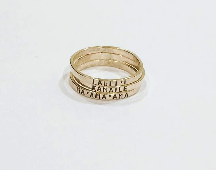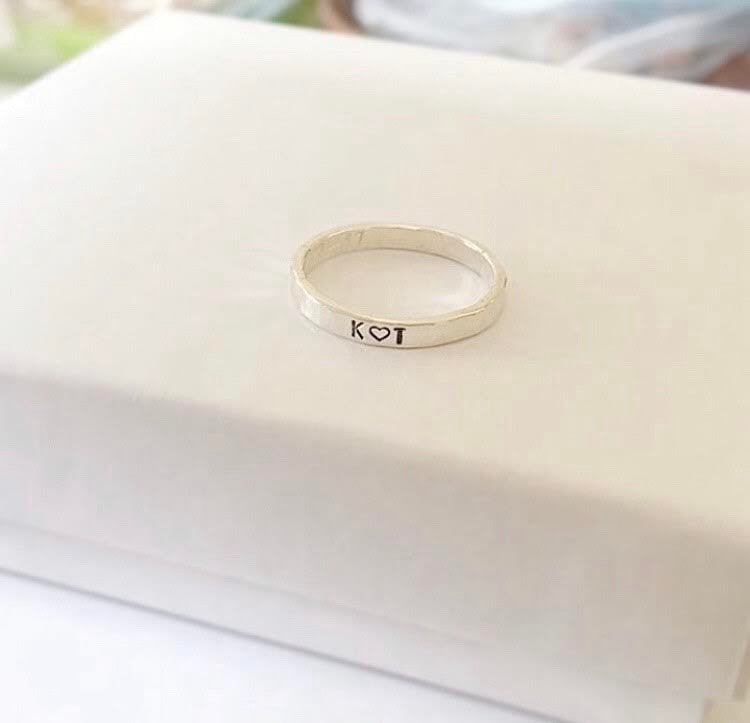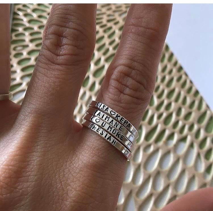 A custom, hand-stamped ring designed to hold a name, date, or word.